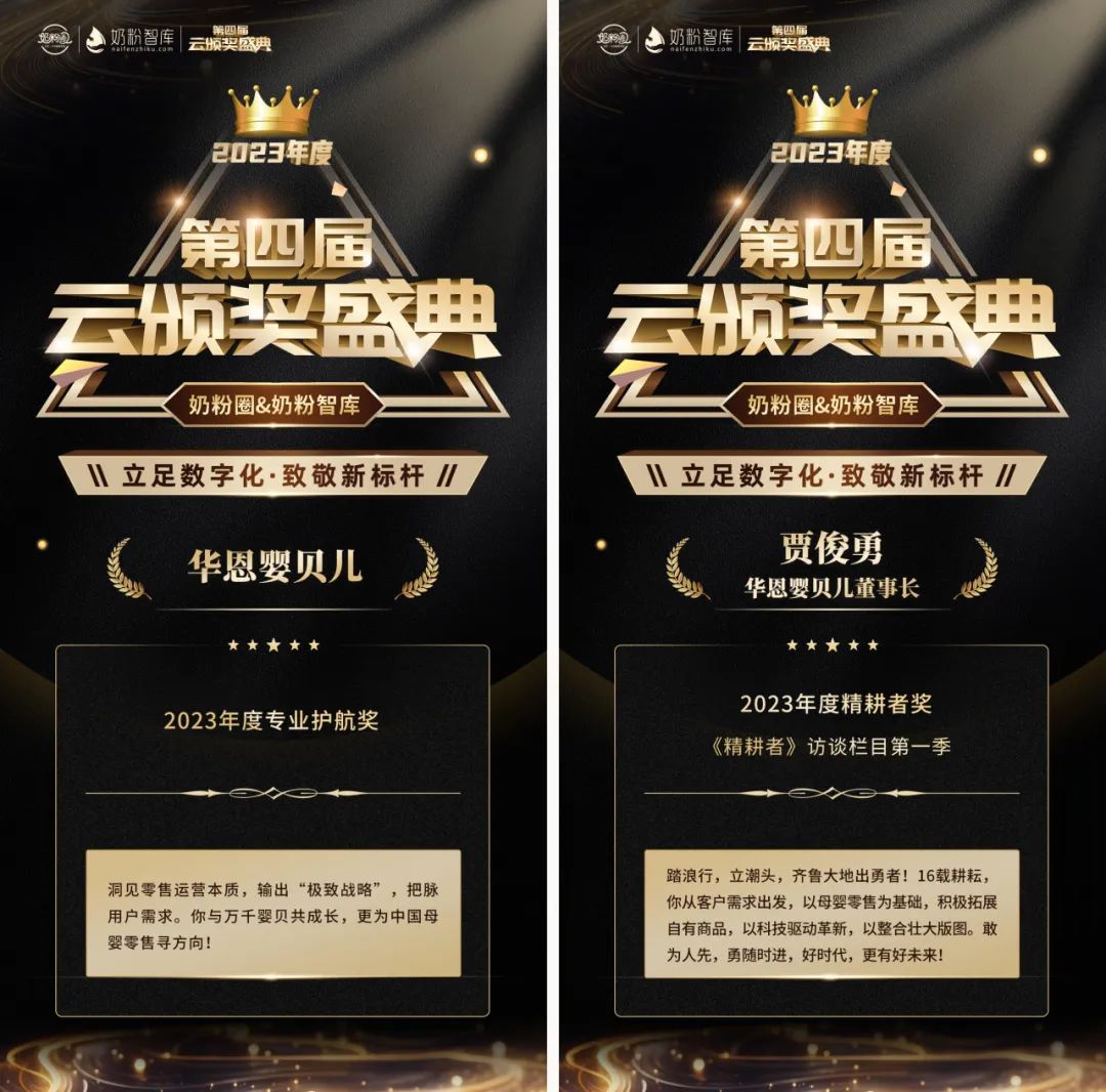第四届云颁奖围绕奶粉、营养品品牌及母婴渠道,共评定出2023年度6大类权威奖项,其中金年会·jinnian(金字招牌)诚信至上以卓越的表现斩获2023年度“专业护航奖”与“精耕者奖”。