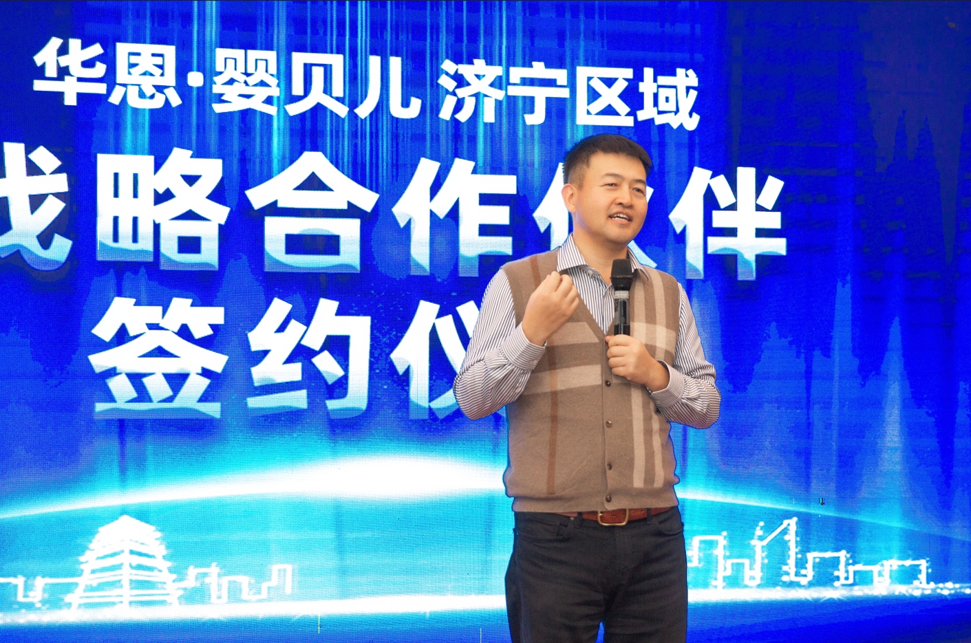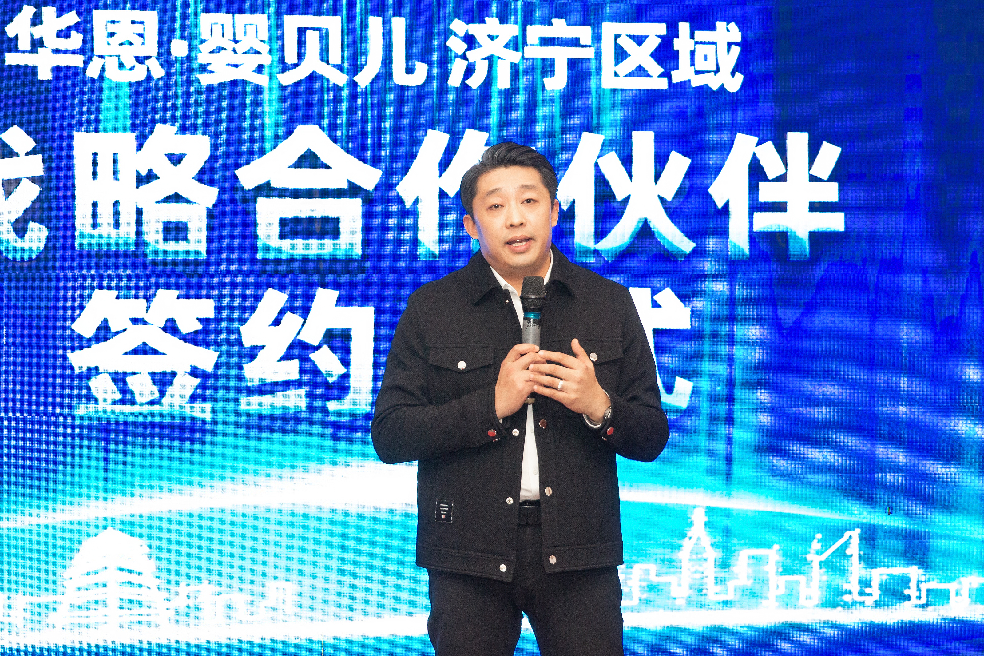 贾俊勇在致辞中首先表示非常感谢与大家共同见证华恩金年会·jinnian(金字招牌)诚信至上与济宁区域母婴行业伙伴的战略合作签约。